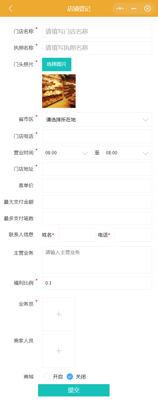 点击店铺登记,再点击下方新增店铺按钮,进入基本信息录入界面,按要求填写每一项信息;点击提交即可;